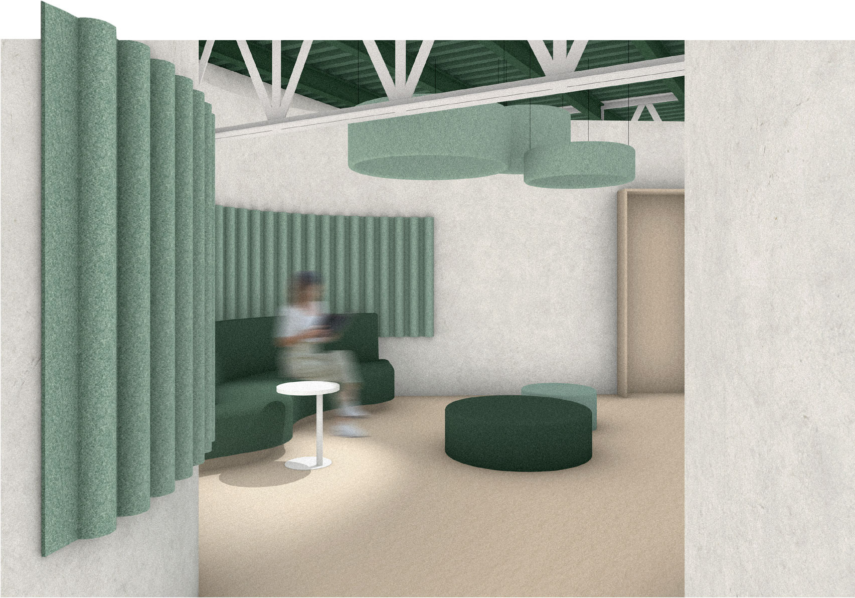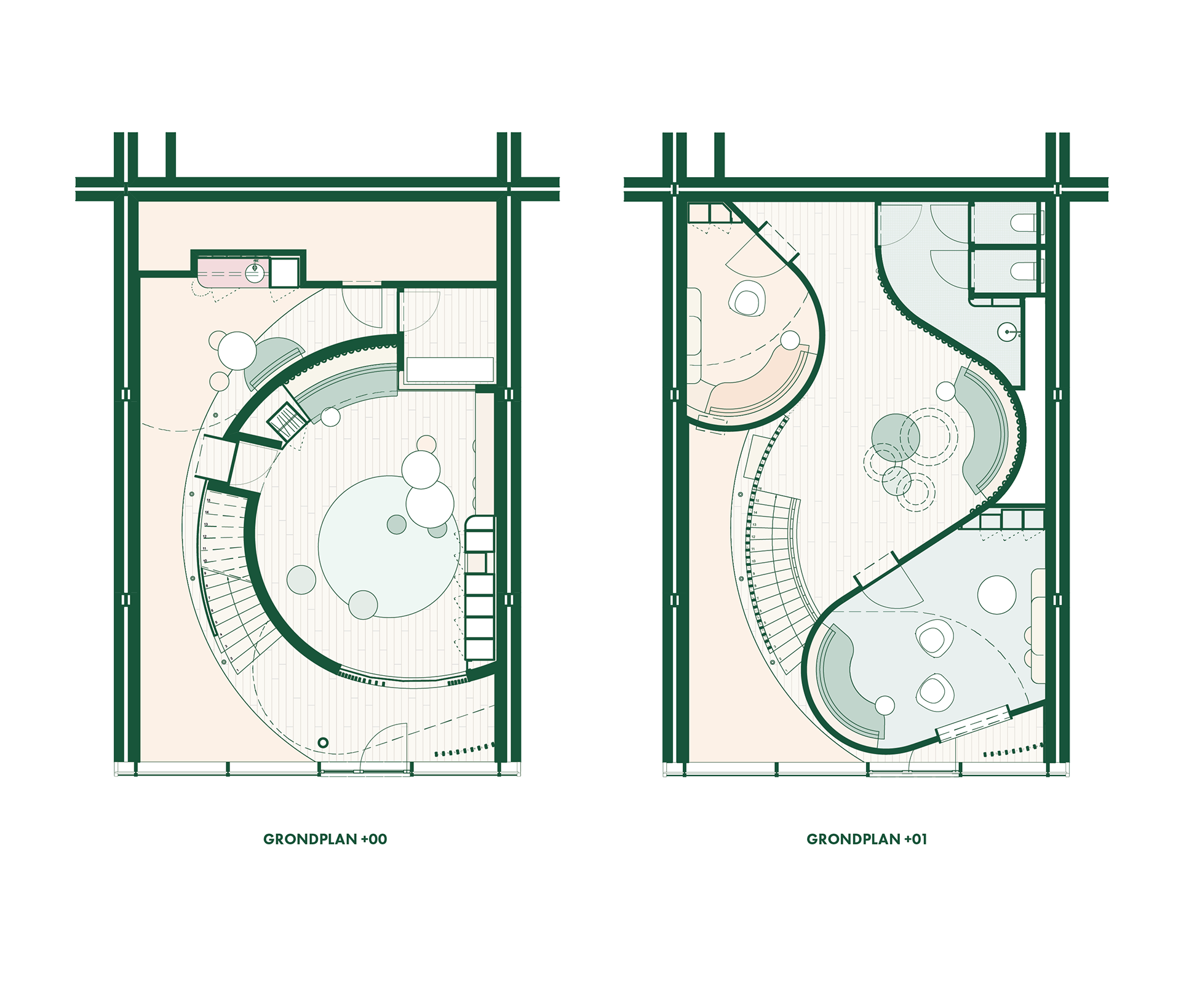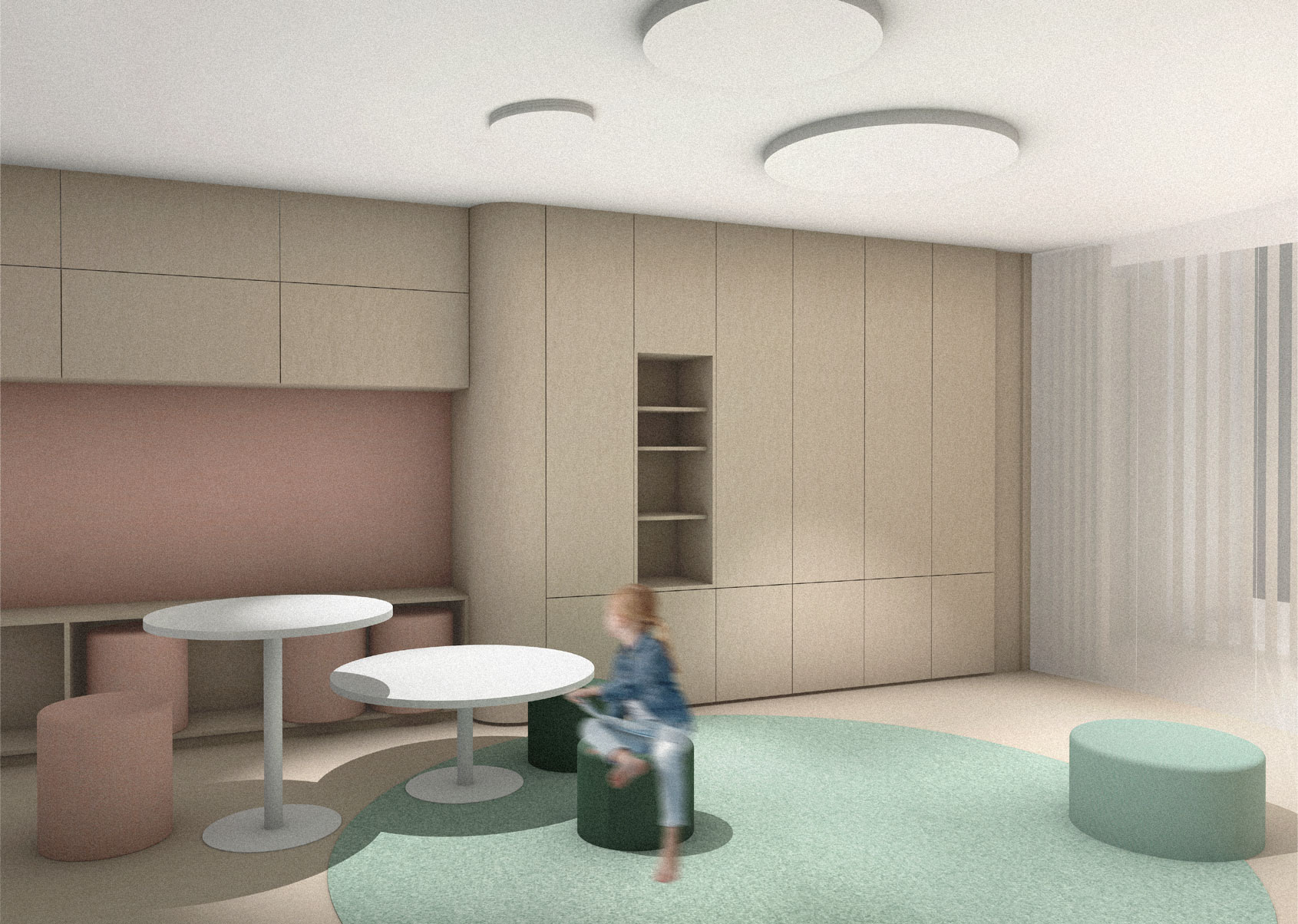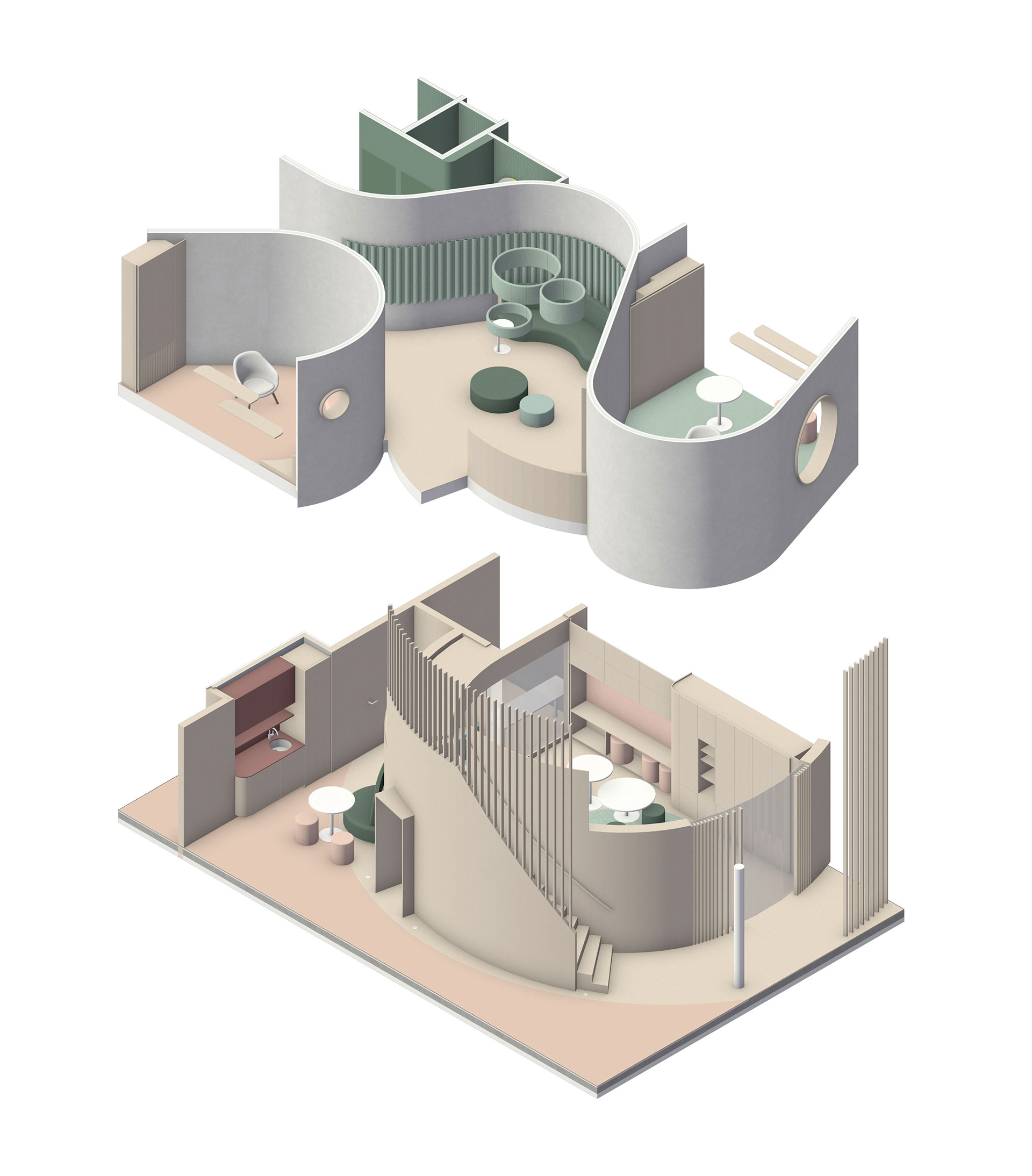 __opdracht__ Ontwerp een werkruimte voor 3 kinderpsychologen in een opgegeven ruimte. __CONCEPT__ Zachtheid primeert, zowel in de gebogen vormentaal als in het materiaal- en kleurgebruik. De opvatting is intiem en discreet. Alle ruimtes en functies zijn afgeschermd van de voorzijde. De toegangen van de consultatieruimtes zijn zo ingeplant, dat ze niet te zien zijn vanaf de straatzijde. De wachtruimte bevindt zich in de buik van de ruimte. De drankcorner achteraan laat zich pas zien wanneer je de ruimte verder naar achter betreedt. In elke ruimte nestelen de op maat gemaakte zitelementen zich in de curves van de ruimtes. __MATERIALEN__ eik fineer licht gebeitst, leempleister ‘Brusseleir’, linoleum, gerecycleerd pet felt