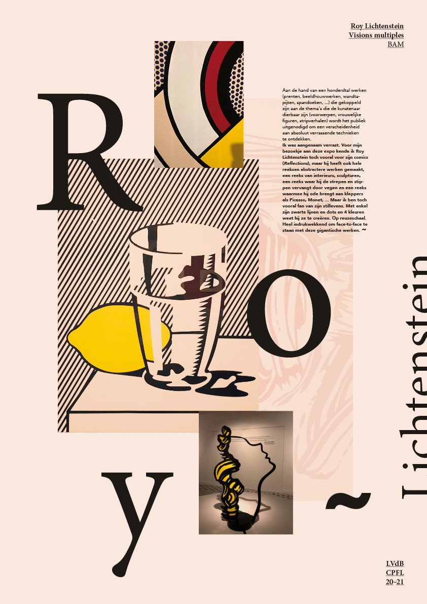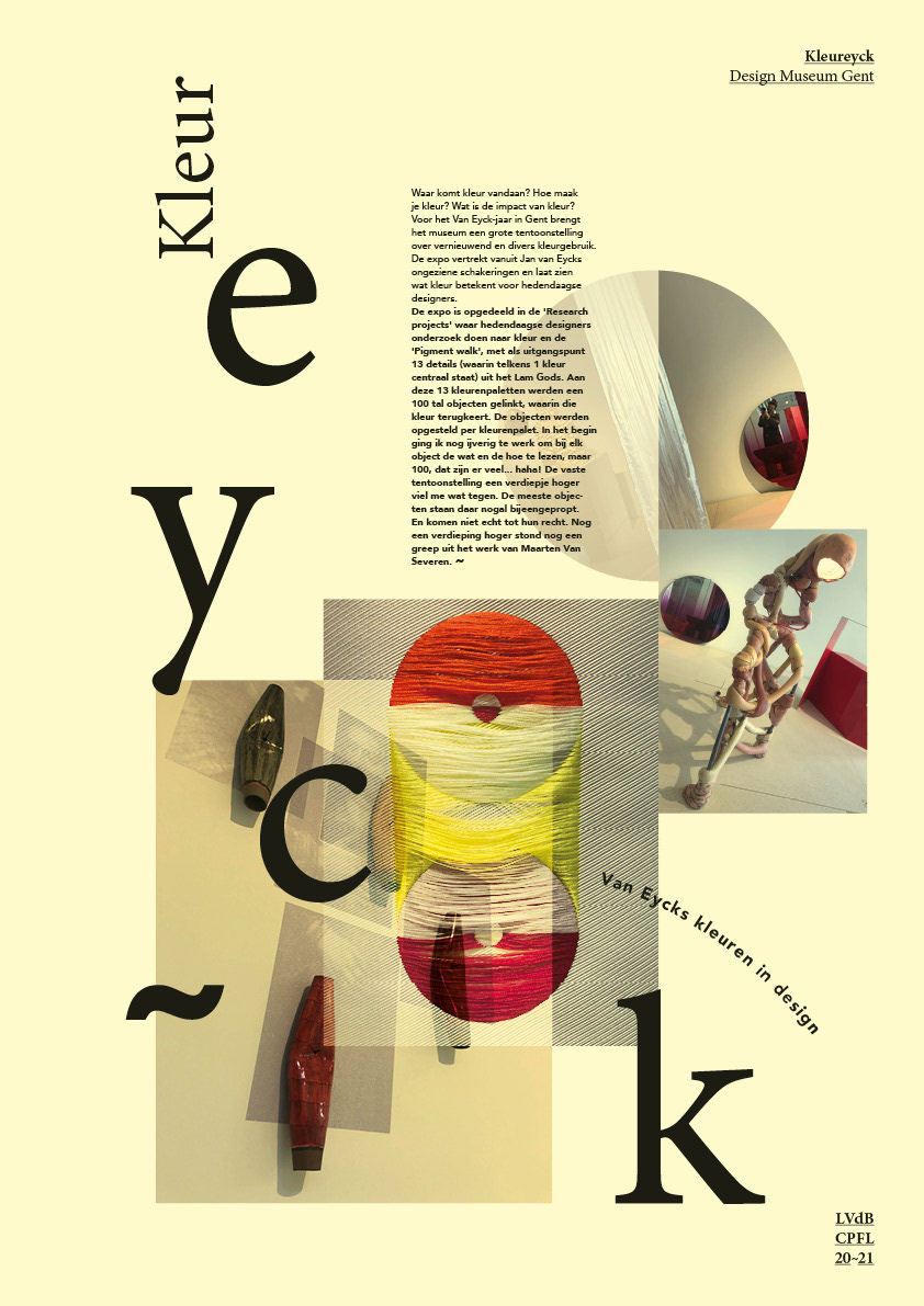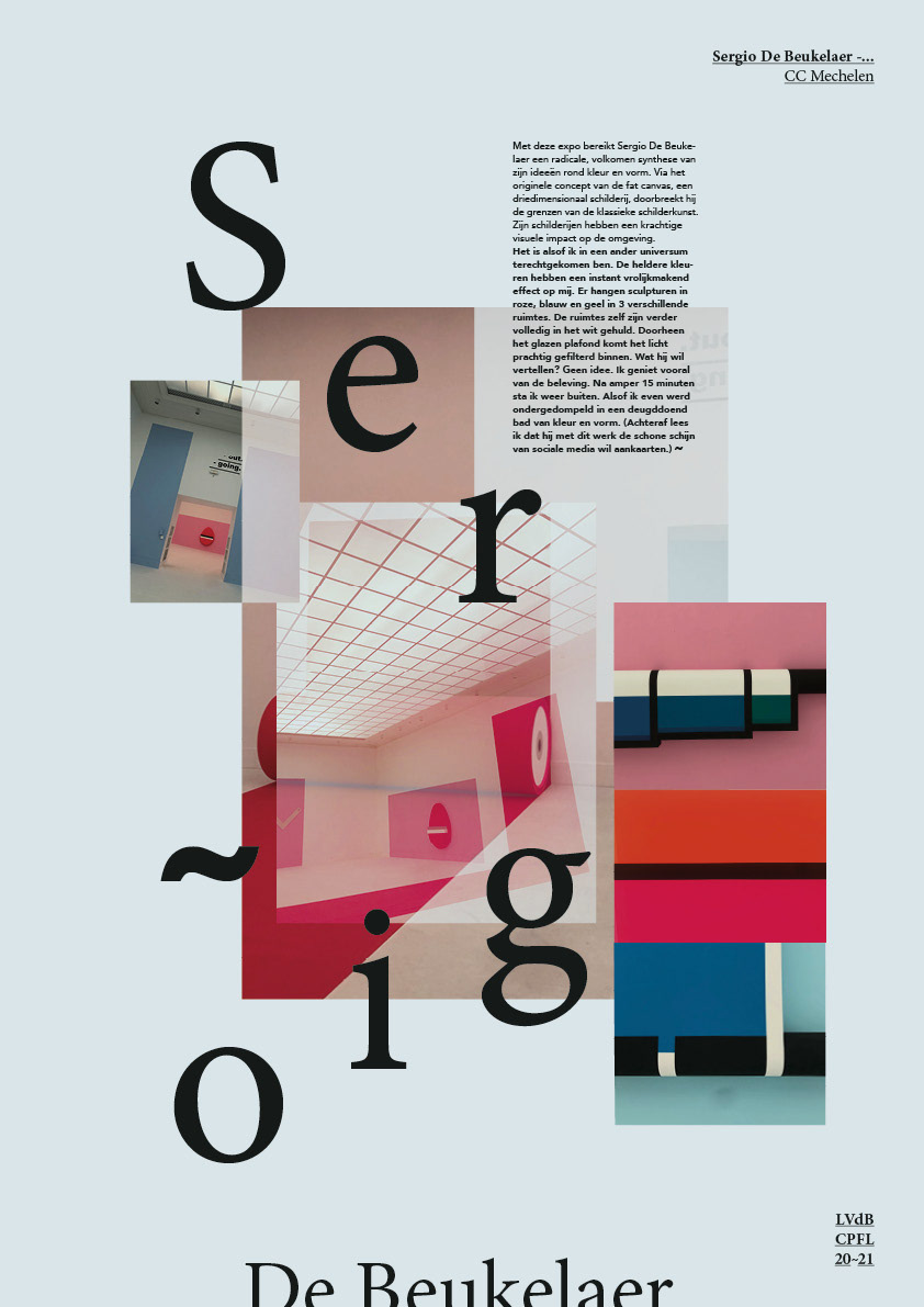 __opdracht__ Verzamelen van culturele ervaringen tijdens de opleiding. __CONCEPT__ Spelen met typografie, beeld, kleur en vorm. Gooi deze ingrediënten bijeen en schud ze door mekaar. Het resultaat zijn 10 kleurrijke posters. Het lijkt willekeur, maar is telkens opnieuw een zoektocht naar een compositie die werkt. __MATERIALEN__ geprint op gekleurd papier