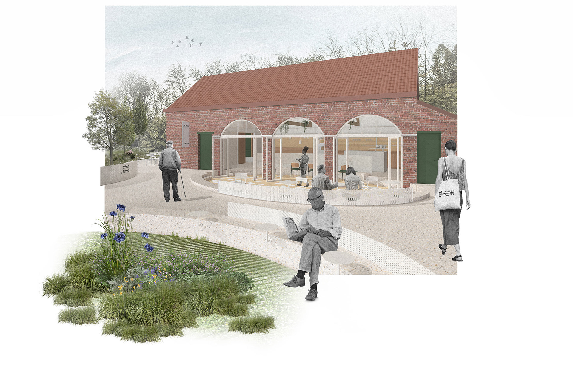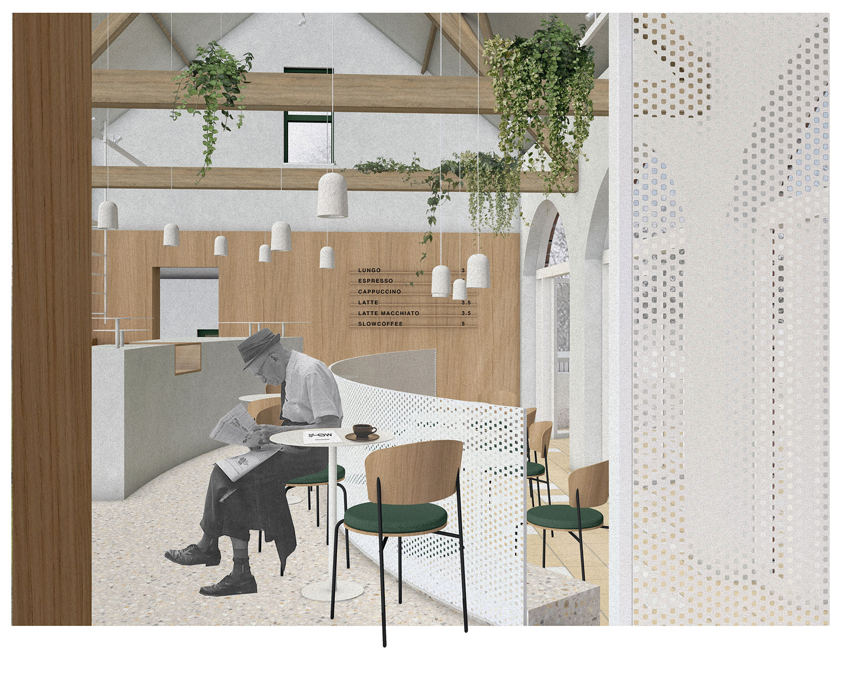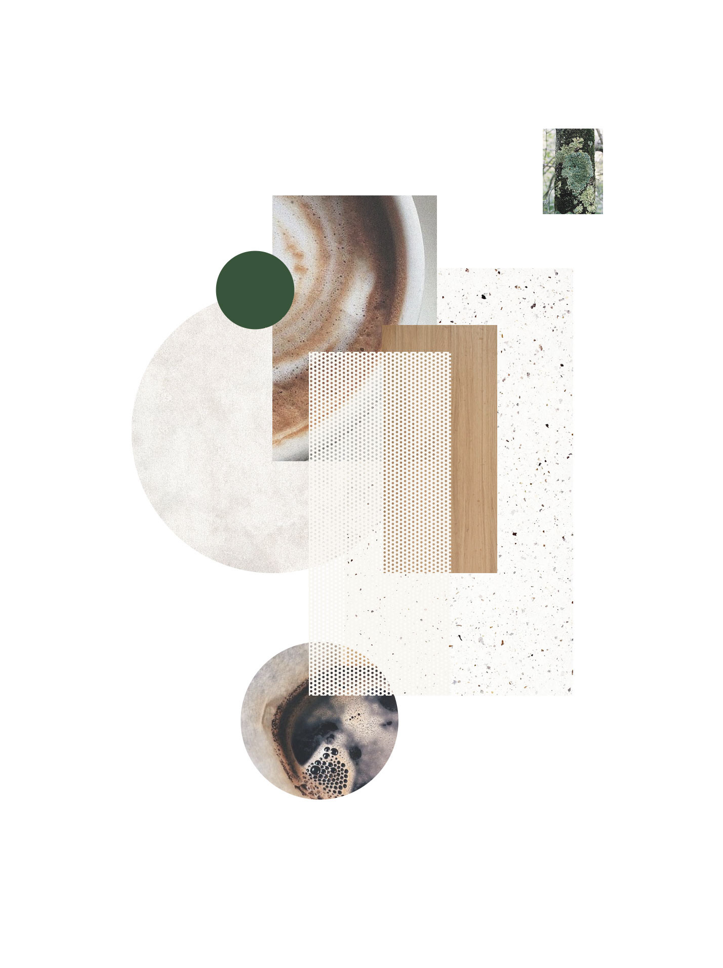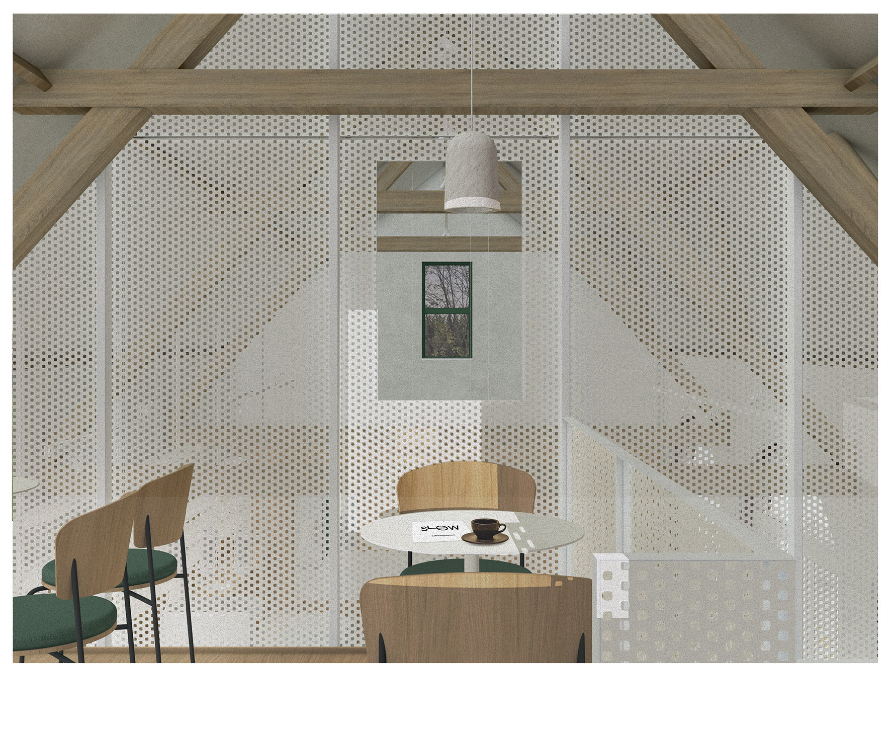 __OPDRACHT__ Bachelorproef herbestemming. Hoe kan de Schranshoeve in OLV-Waver, gelegen temidden van de laatste overblijfselen van het Waverwoud, herbestemd worden tot een rustgevende plek waar natuur, erfgoed en ambacht centraal staan?__programma__ Koffiemo(nu)ment: koffiebranderij, koffiebar en overnachten in een 16e eeuws monument (b&b). __CONCEPT__ BLENDEN. De drie gebouwen zijn verbonden dmv een verhoogd plein met uitsparingen dat zorgt voor een sterke connectie binnen/buiten. In de tuin zorgt flora uit het Waverwoud en de zitelementen — waarvan er ook enkele verspreid worden in het Waverwoud — voor een connectie met het Waverwoud. Blenden van oud en nieuw: voorzetwand in geperforeerd staal (buitengevels schuur en binnenwand koetshuis). COLORS OF COFFEE. __materialen__ leempleister, eik, marmerbeton, staal.