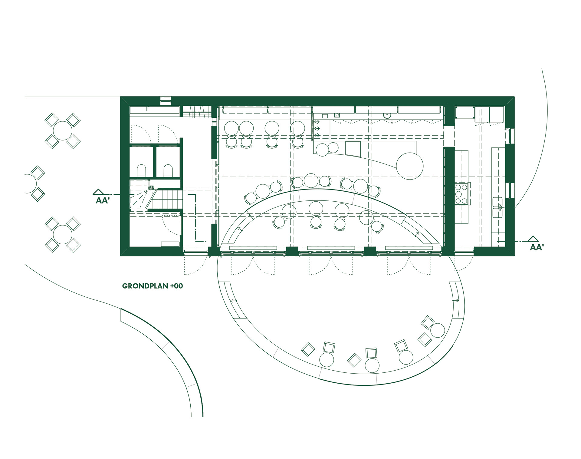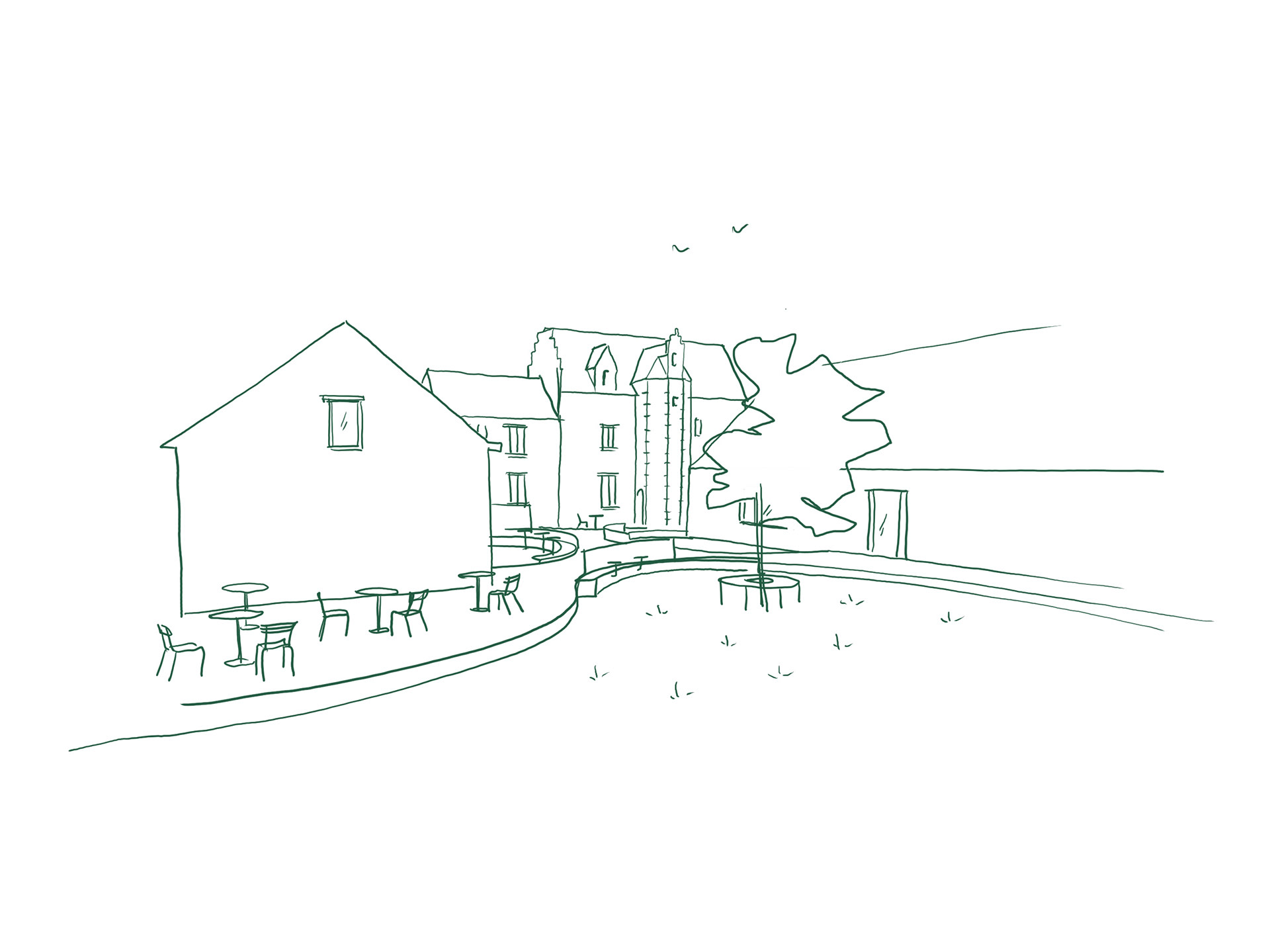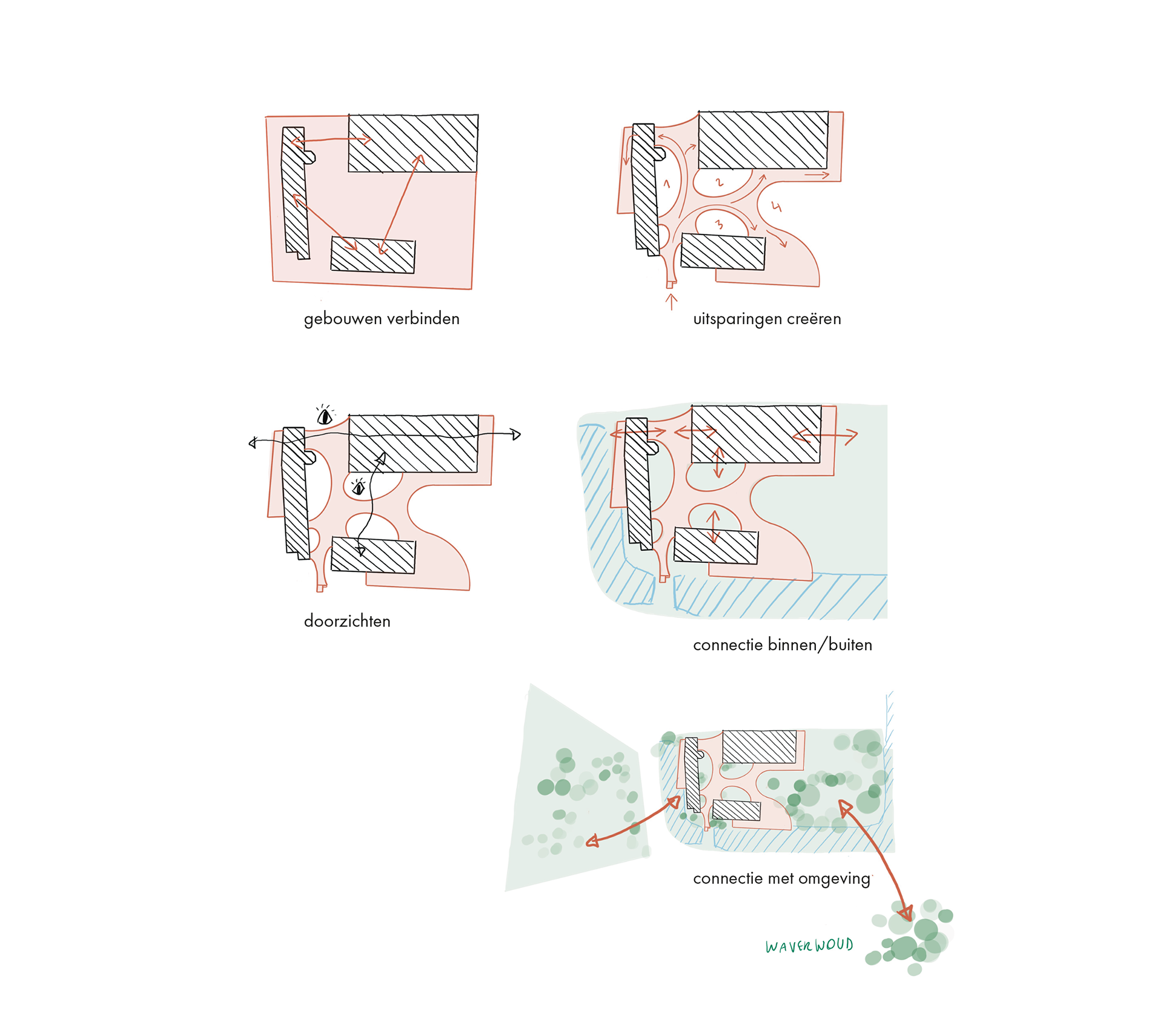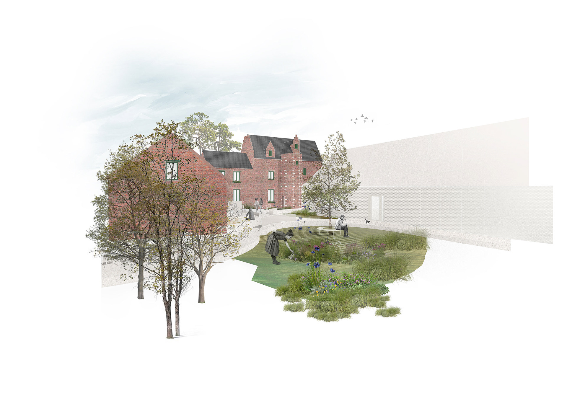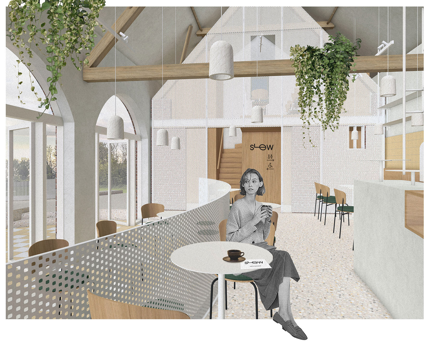 __OPDRACHT__ Bachelorproef herbestemming. Hoe kan de Schranshoeve in OLV-Waver, gelegen temidden van de laatste overblijfselen van het Waverwoud, herbestemd worden tot een rustgevende plek waar natuur, erfgoed en ambacht centraal staan?__programma__ Koffiemo(nu)ment: koffiebranderij, koffiebar en overnachten in een 16e eeuws monument (b&b). __CONCEPT__ BLENDEN. De drie gebouwen zijn verbonden dmv een verhoogd plein met uitsparingen dat zorgt voor een sterke connectie binnen/buiten. In de tuin zorgt flora uit het Waverwoud en de zitelementen — waarvan er ook enkele verspreid worden in het Waverwoud — voor een connectie met het Waverwoud. Blenden van oud en nieuw: voorzetwand in geperforeerd staal (buitengevels schuur en binnenwand koetshuis). COLORS OF COFFEE. __materialen__ leempleister, eik, marmerbeton, staal.