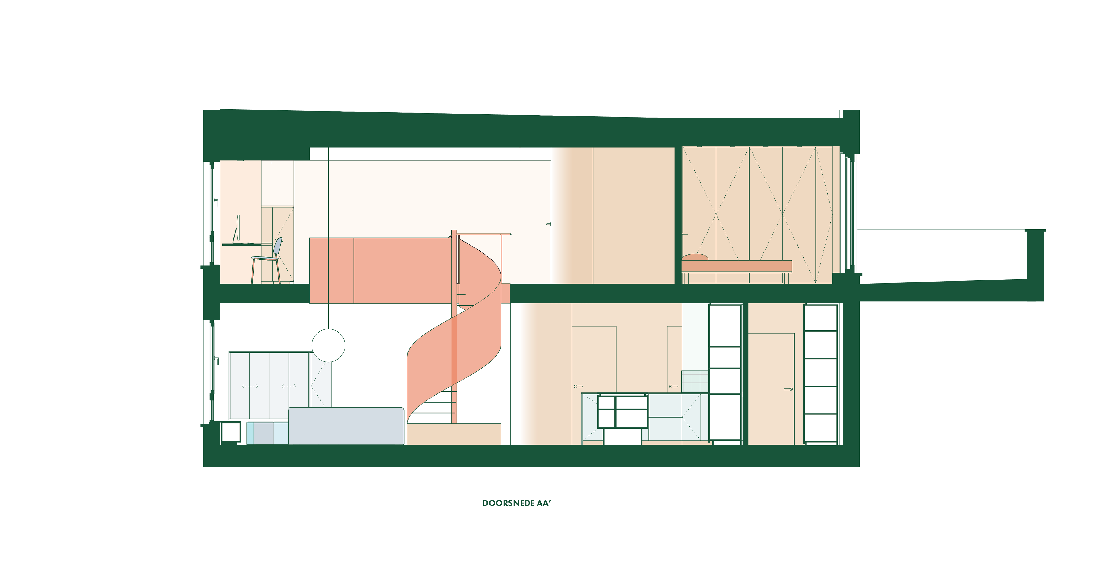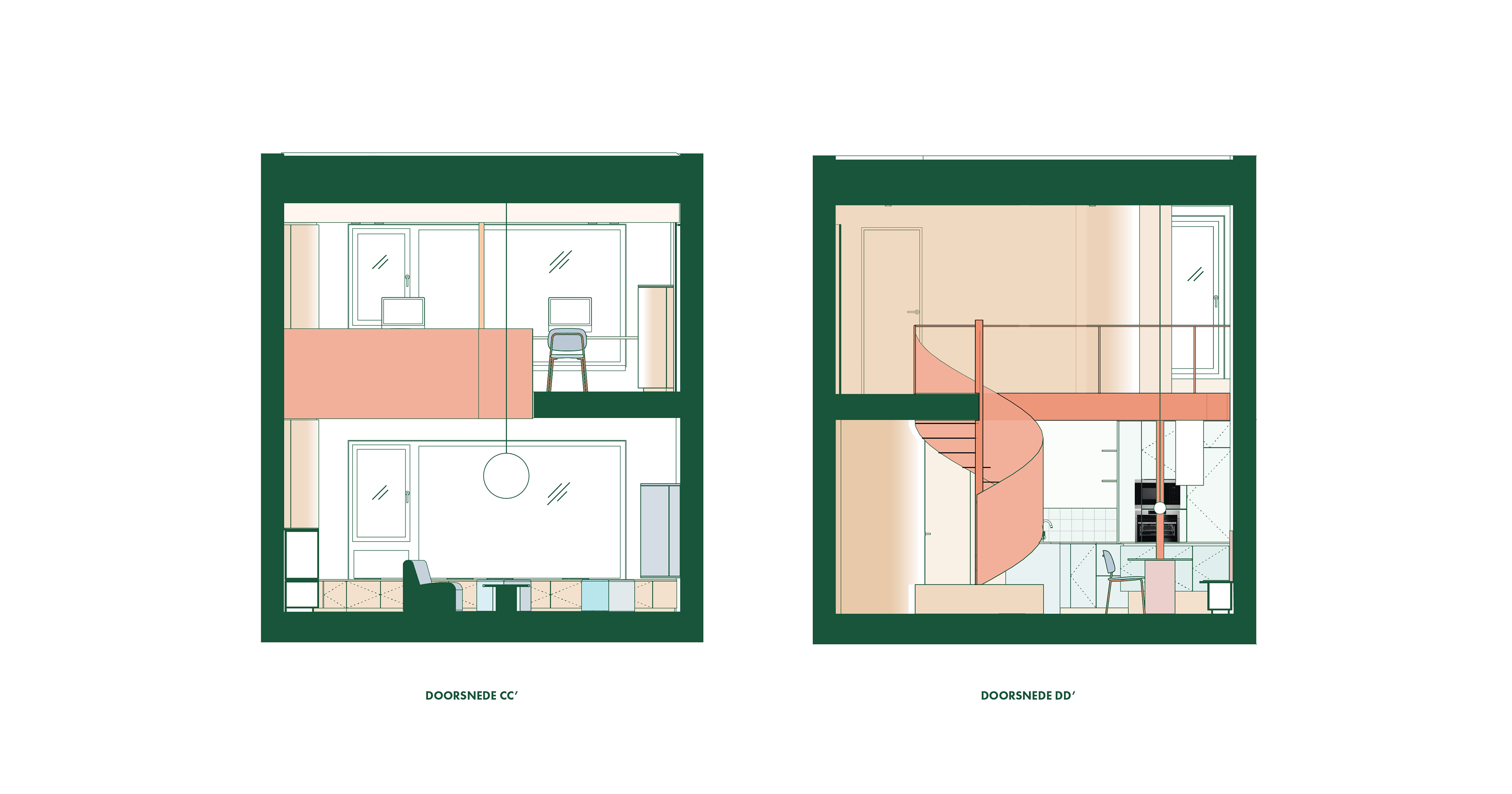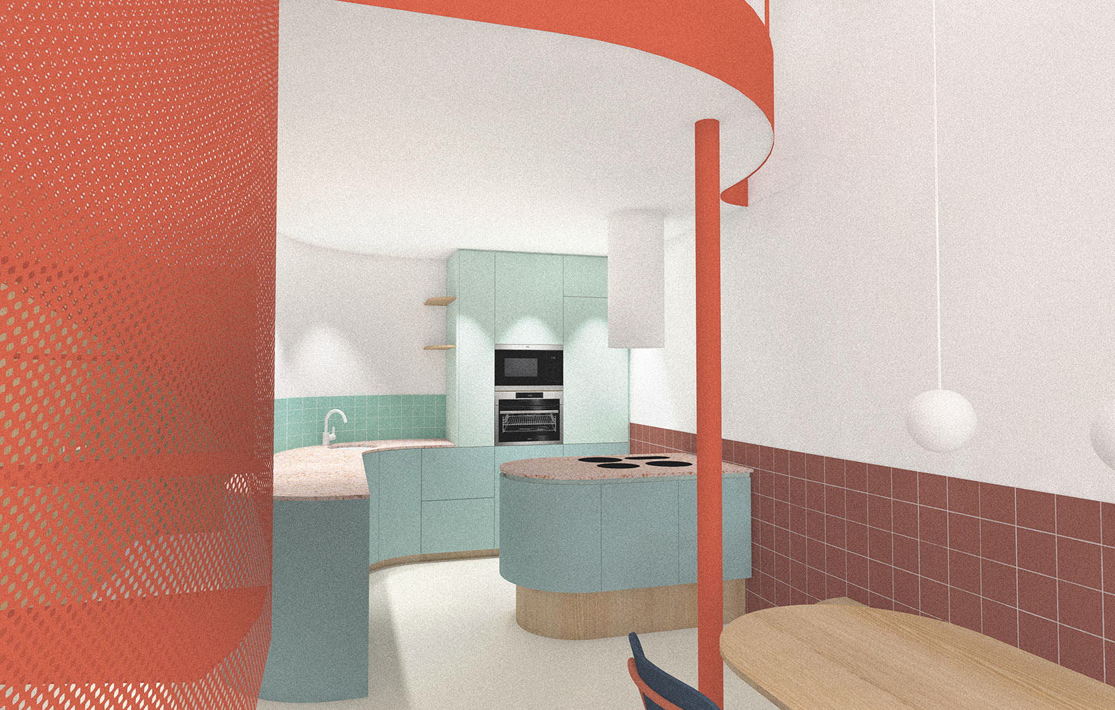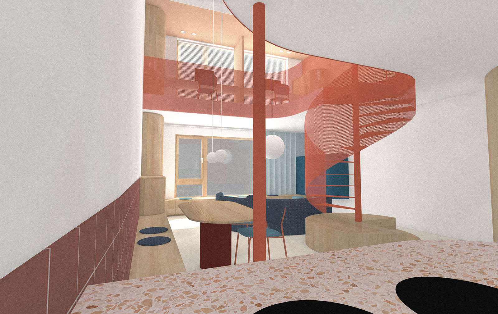 __opdracht__ ontwerp het interieur van een opgegeven appartement met als bewonersprofiel kleurrijk en sensueel. __CONCEPT__ De trap in het midden van de ruimte verbindt met een zwierige beweging alle ruimtes met elkaar. De fluide circulatie zorgt voor een grote verbondenheid met vele doorzichten. Alle functies zijn bepaald door een kleur. In de vormgeving zijn geometrische figuren de basis. __MATERIALEN__ lariks hout, linoleum (vloer en meubel), terrazzo, gepoedercoat staal, petfelt
