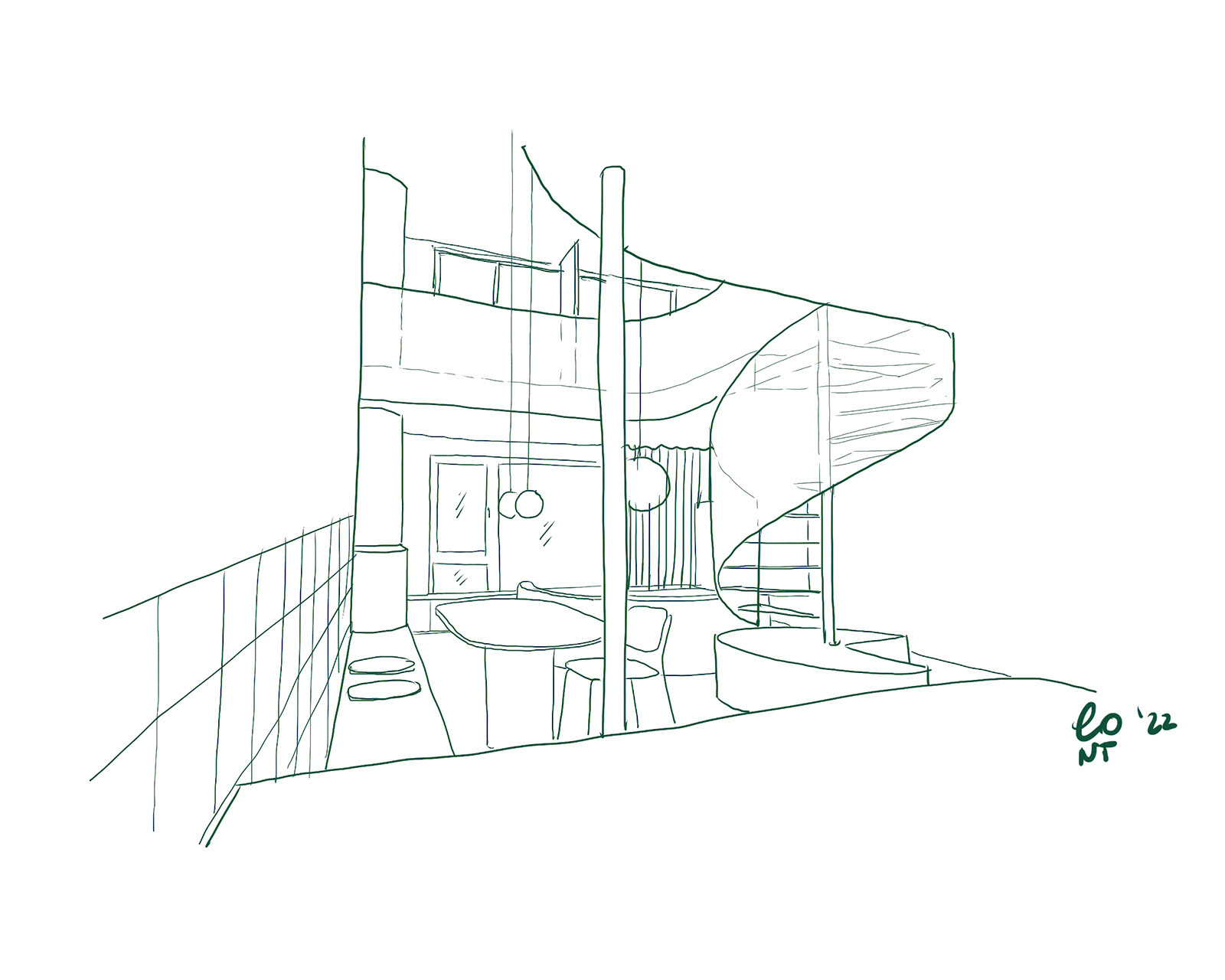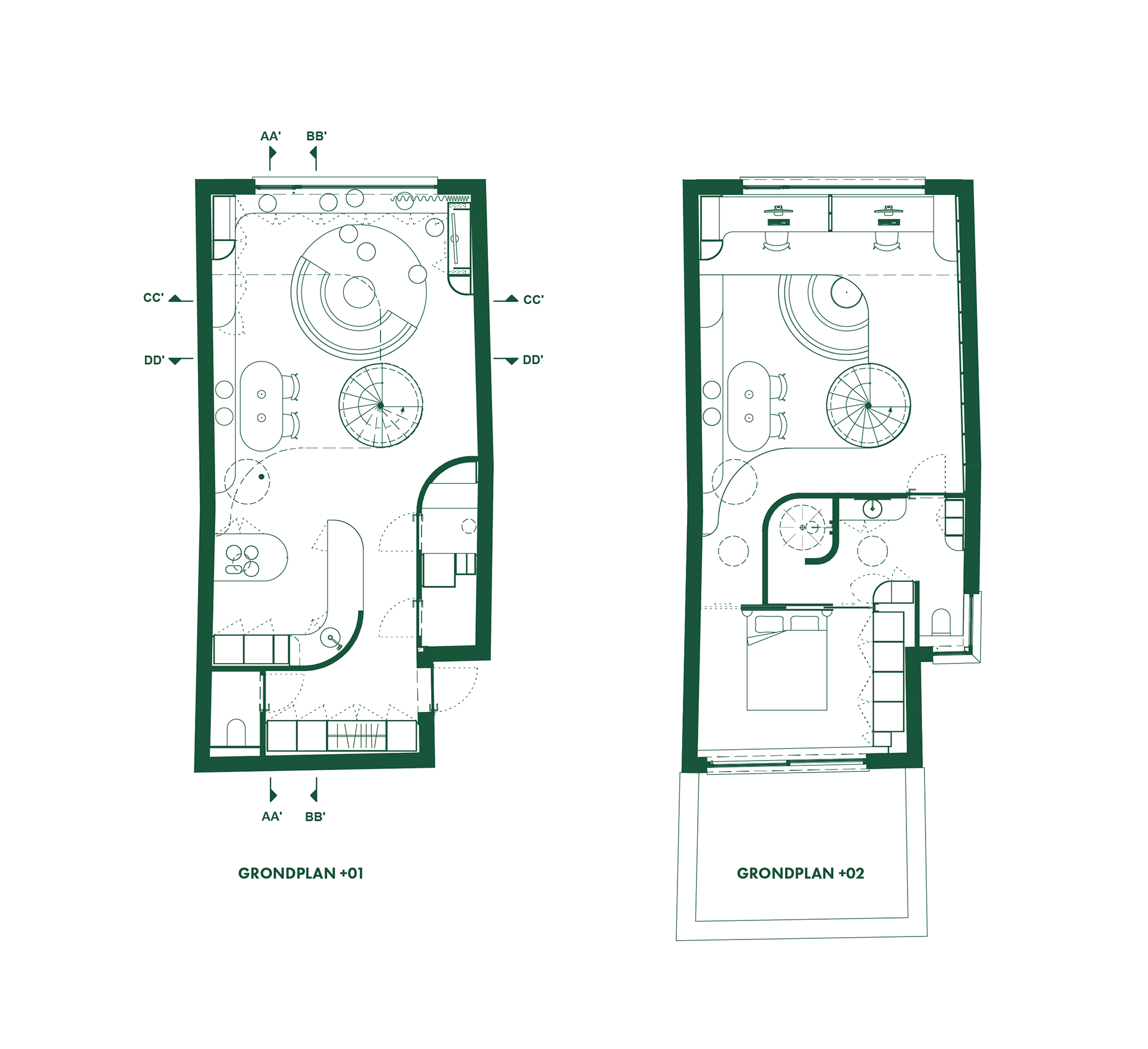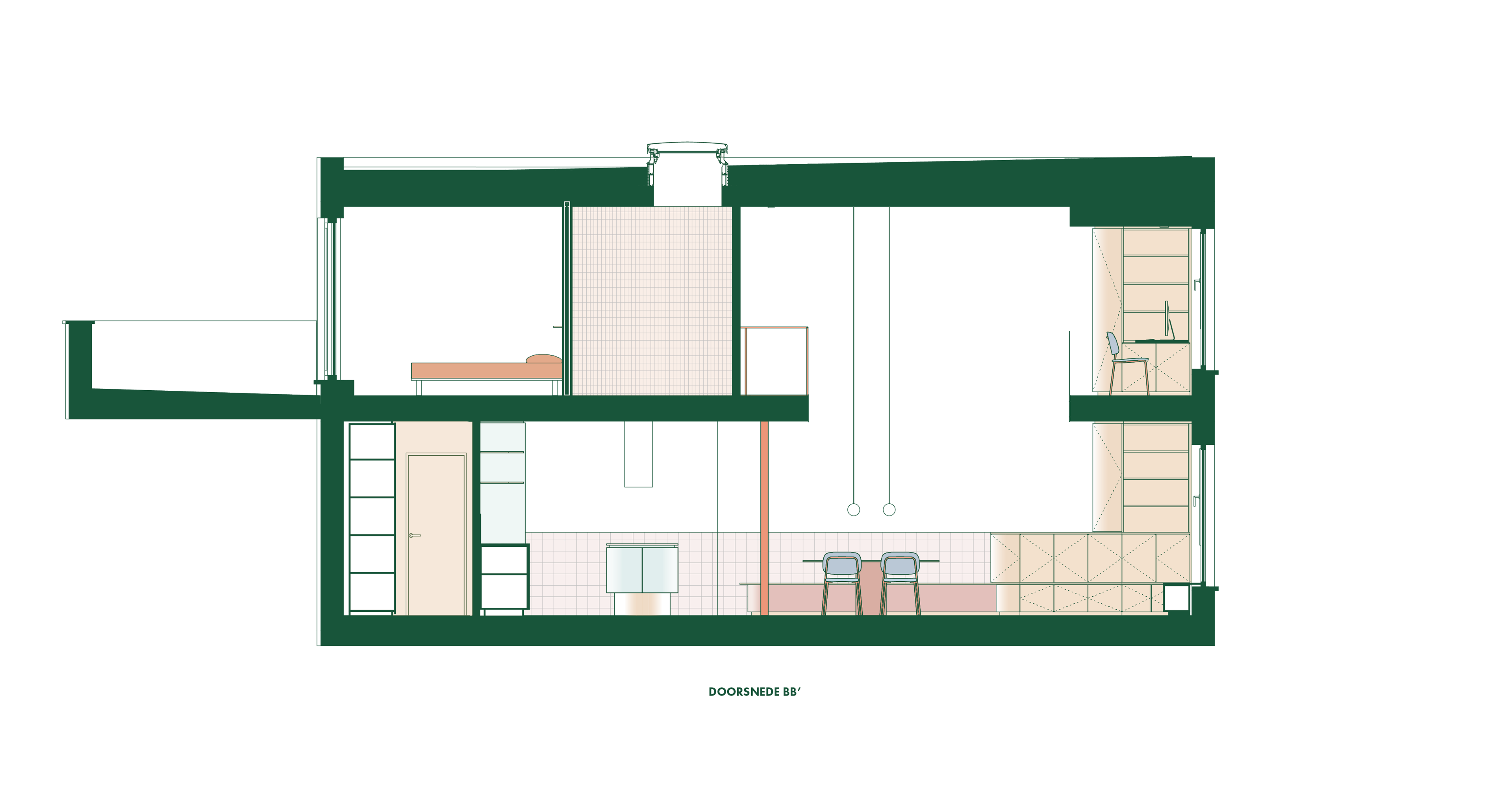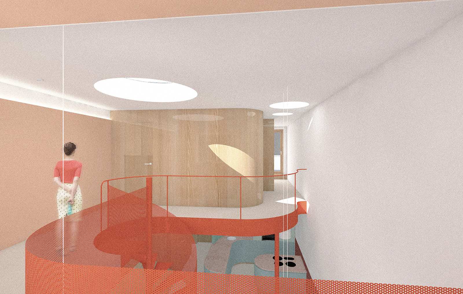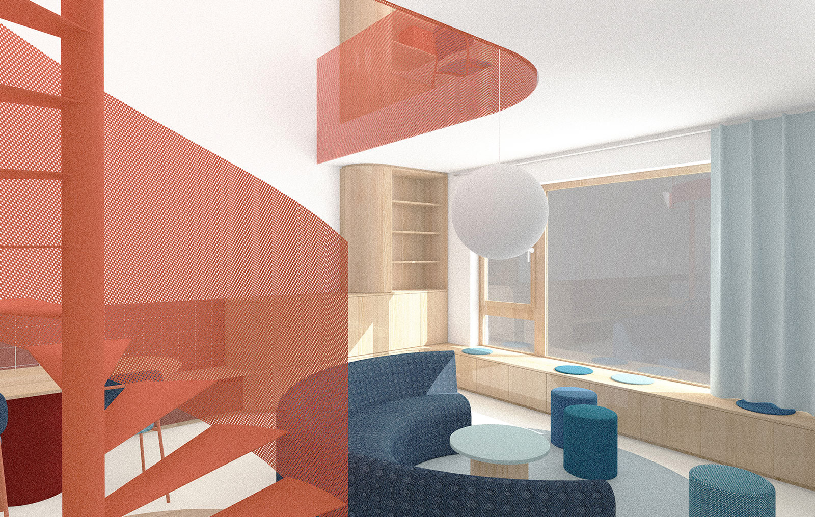 __opdracht__ ontwerp het interieur van een opgegeven appartement met als bewonersprofiel kleurrijk en sensueel. __CONCEPT__ De trap in het midden van de ruimte verbindt met een zwierige beweging alle ruimtes met elkaar. De fluide circulatie zorgt voor een grote verbondenheid met vele doorzichten. Alle functies zijn bepaald door een kleur. In de vormgeving zijn geometrische figuren de basis. __MATERIALEN__ lariks hout, linoleum (vloer en meubel), terrazzo, gepoedercoat staal, petfelt