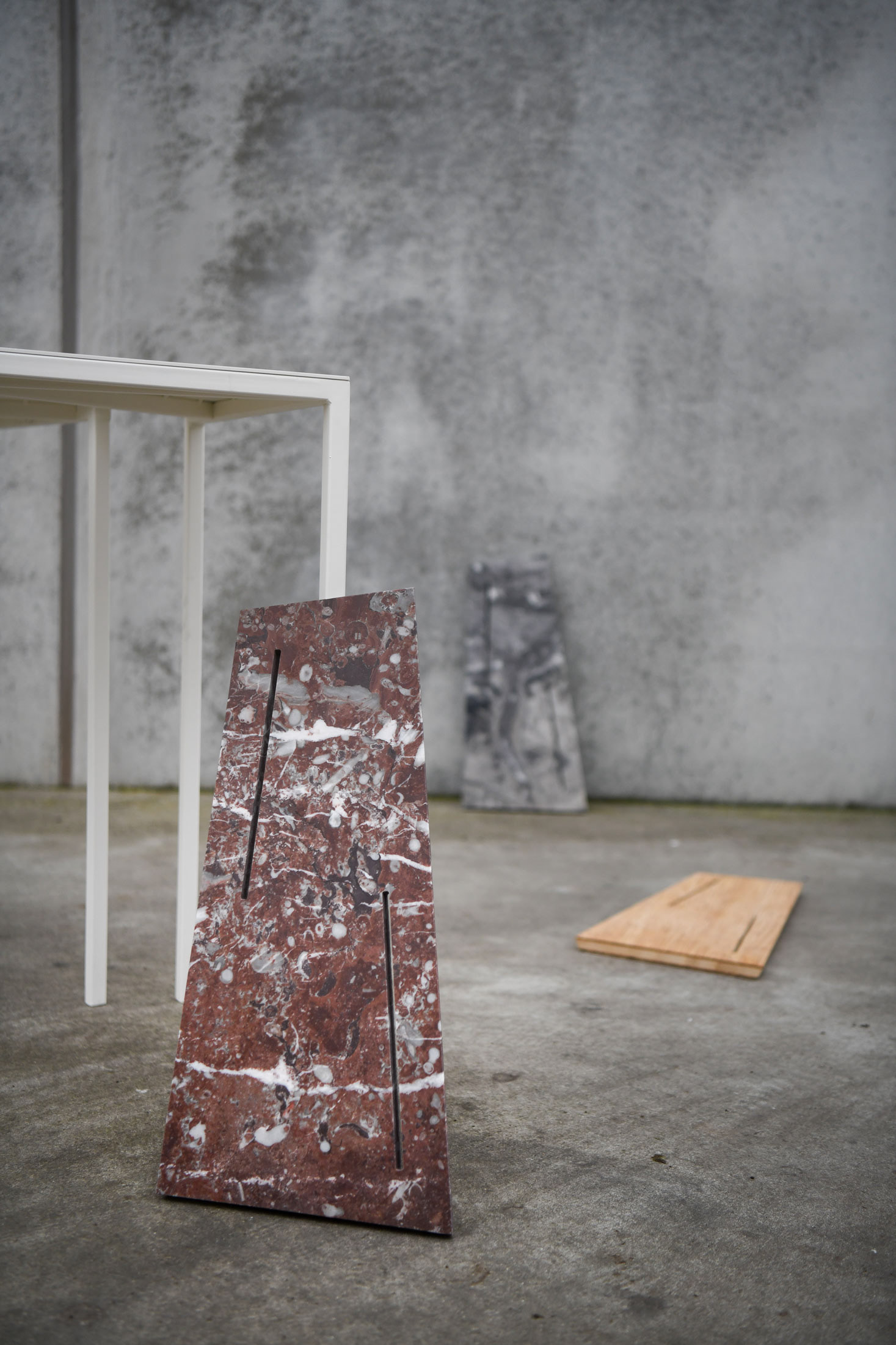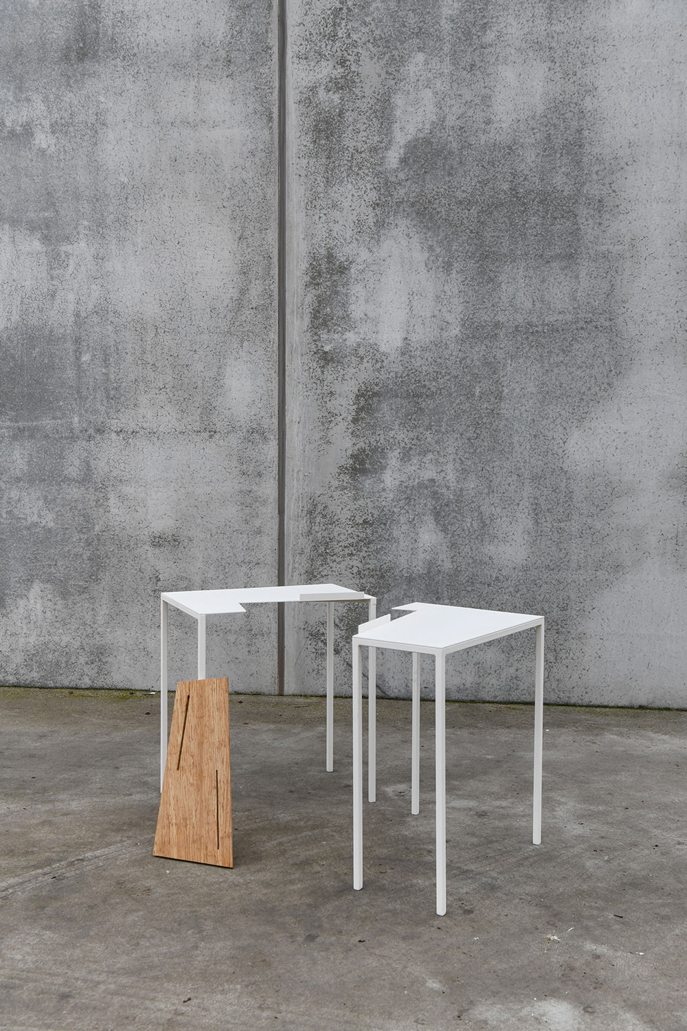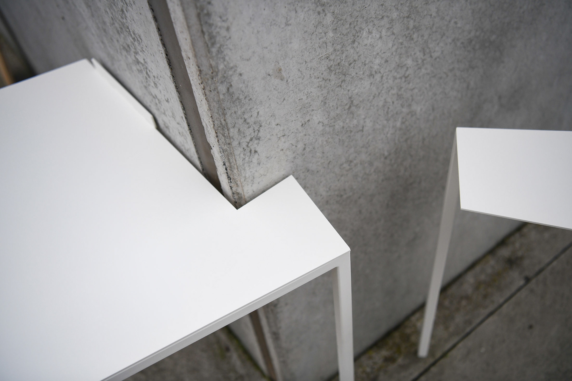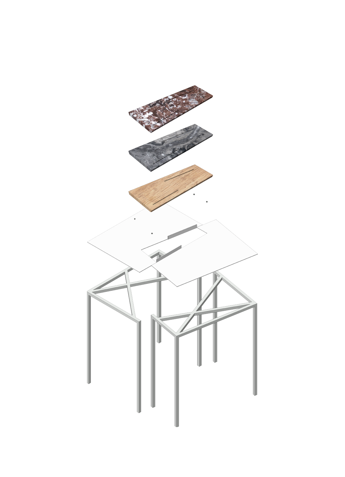 __opdracht__ Ontwerp een tête-à-tête tafel met een duidelijk en doorgedreven concept. __CONCEPT__ Zet twee mensen bij mekaar en laat ze in gesprek gaan. De ruimte tussen hen zal opgevuld worden met nieuwe ideeën en inzichten. Deze ruimte voor dialoog maakt dat mensen zich verbonden voelen met mekaar. De space inbetween wordt hier in het ontwerp weergegeven met een contrasterend materiaal. Verschillende opstellingen zijn mogelijk: verbonden als één geheel, als twee aparte tafels of geplaatst rond een hoek. Het middenstuk kan bij de individuele opstelling apart gebruikt worden als snij- of serveerplank en is gemaakt in verschillende varianten, uit reststukken of bouwafval. __MATERIALEN__ staal, marmer, bamboo density pressed